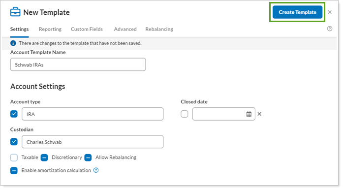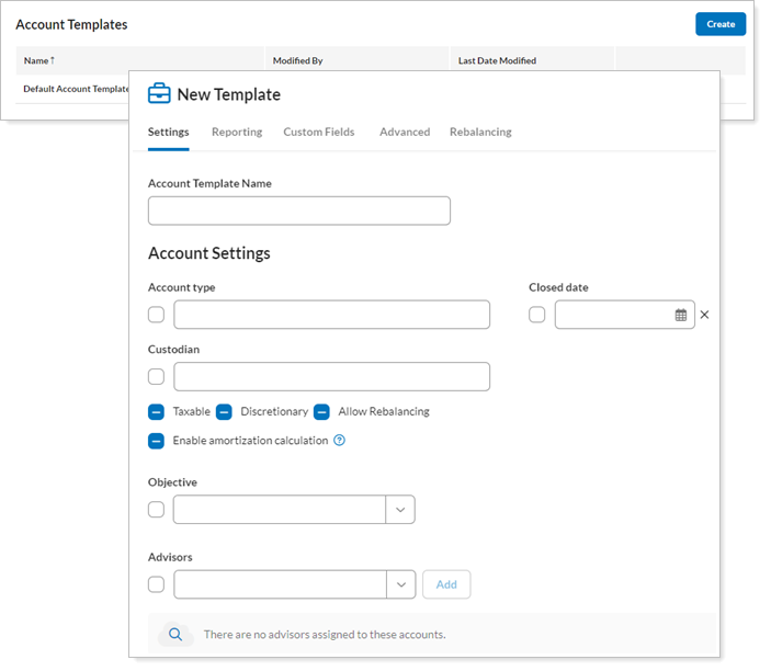 An account template is a collection of account settings that you can save using a unique name and then assign to individual accounts. When you apply a template to an account, you save the time spent applying individual account settings in separate accounts. Because the account settings are standardized in a single template, you also avoid errors in account settings. You can use account templates to apply standard settings to new accounts, implement widespread account settings changes, standardize settings for accounts with different custodians, apply settings based on the size or the objective of the account, and more.