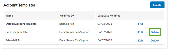 Click Delete next to the account template you'd like to delete. You can change the name of the default account template, but you cannot delete it.
