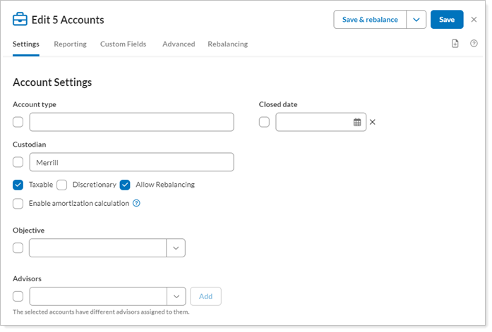 In the slide-out panel, make any additional changes to account settings for the selected accounts. This step is optional.