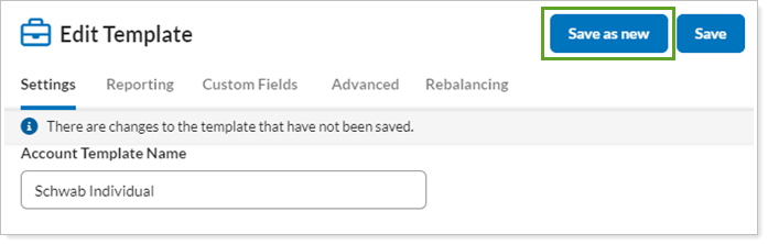 Once you've created an account template, you can copy that account template under a new, unique name. This allows you to create alternate versions. For example, you can use an existing account template like Fidelity Accounts and save an alternate version like Fidelity Accounts - Under 100K. You can then modify the new account template while retaining the settings from the original account template.