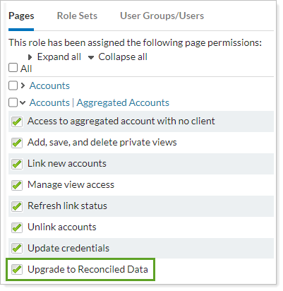 To convert balance-only accounts to reconciled accounts, your user must have Upgrade to Reconciled Data selected under Accounts | Aggregated Accounts.