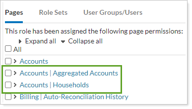 To see the Aggregated Accounts page, your user must belong to a role that has the following page permissions: