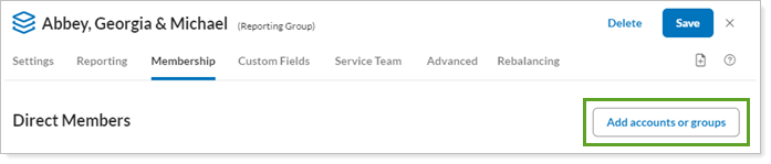 Membership Direct Members This panel contains a list of accounts and groups that are direct members of the selected group. Here, you can specify which direct members will be included in PDF reporting. This is also where you specify which accounts will be part of a group.