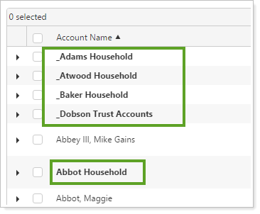 For example, Mr. and Mrs. Abbey each benefit from several individual and joint accounts they hold. Accounts with a common beneficiary—such as Mr. and Mrs. Abbey—can be grouped together for group-level rebalancing.