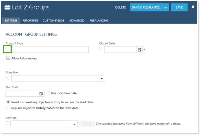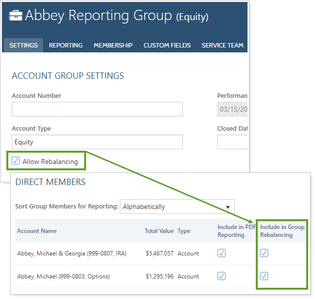 Once you create a group, you must enable it for rebalancing by selecting the Allow Rebalancing check box on the Account Group Settings panel for the group, and select the accounts within the group that will be rebalanced together by selecting the Include in Group Rebalancing check box on the Direct Members panel.