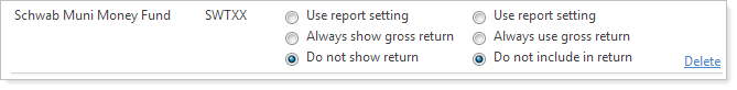 The portfolio's return is calculated independently from the displayed return for cash and will always publish the true (unaltered) net or gross of fee return. Electing to alter a cash security's return or the category return is for display purposes only and does not have any effect on the portfolio's published return.