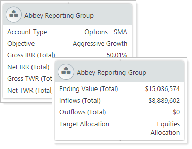 What clients own which accounts? What returns or flows occurred in the accounts? Add a wide variety of data points to each card type, including primary owner, service team, returns, flows, and more.