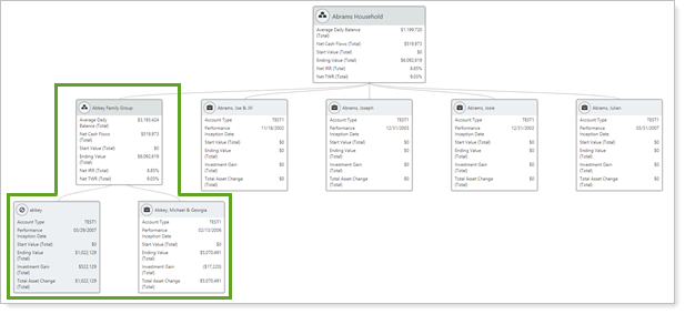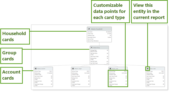 The relationship diagram shows how accounts, groups, and Households are connected with each other by displaying connections in a visual tree structure. Each entity is displayed on a card, and each card displays fully customizable data points. This diagram shows how accounts and groups are organized within groups and Households. It can also be useful for troubleshooting setup and understanding complicated Household structures.