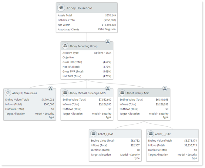 Easily identify how entities relate to one another. See a tree mapping out connections between accounts, groups, and Households.
