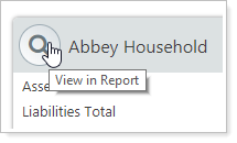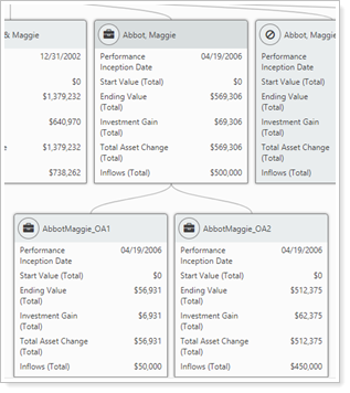 When you hover over the account, group, or Household icon on a specific card, it changes to a magnifying glass. Click this to display the report for that entity. This is useful if, for example, you want to look at the performance of a group and then each of its direct members individually.