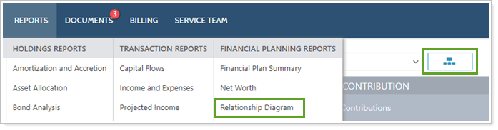 Share the relationship diagram with your clients to help them visualize how their accounts and groups relate to each other. The Relationship Diagram is available as a report page under Client Views or next to the Find Data For list. In client portals, it shows only accounts and groups in that client's Household.