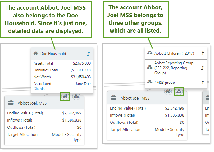 Any account or group that belongs to multiple groups or Households is marked with a Quick Look button. You can: