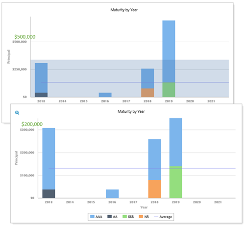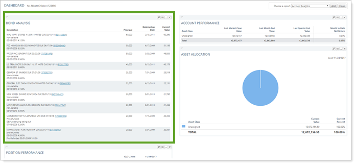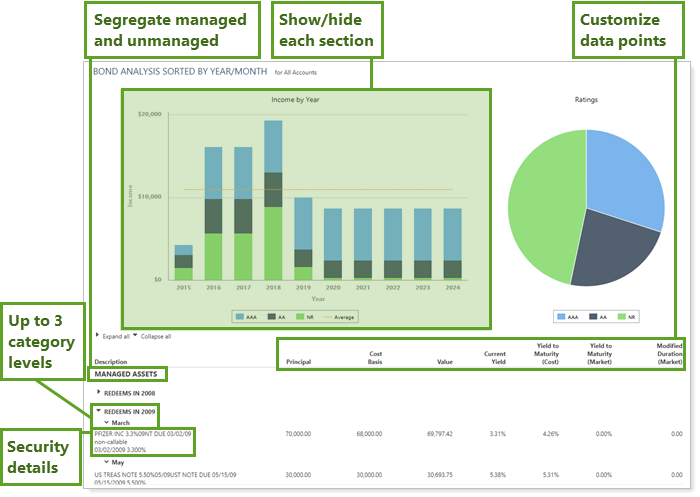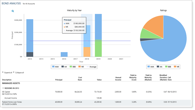In the Bond Analysis report, you will find versatile sorting and charting options that let you answer many bond-related questions about your clients' portfolios, such as: