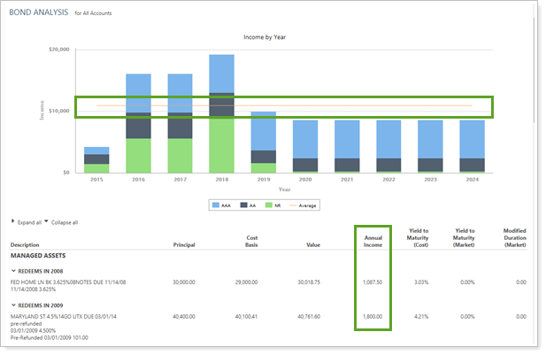 The Bond Analysis report breaks down bond details for fixed income securities in three different displays to help you evaluate different aspects of a client's bond portfolio: