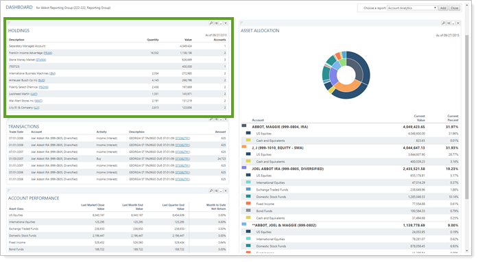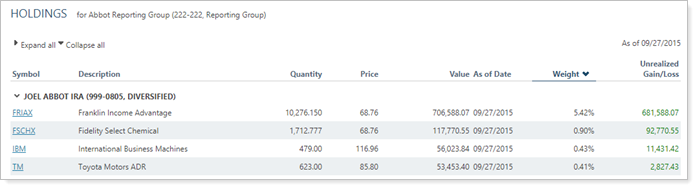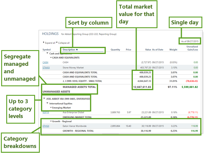 In the Holdings report, you will find detailed data reporting options that let you answer many holdings-related questions about accounts and groups, such as: