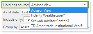 You can choose the data source: Either the custodian or Advisor View. If you choose Advisor View, the data could come from your portfolio accounting system, or from the custodian. To learn more about setting the data source, see Holdings Source.