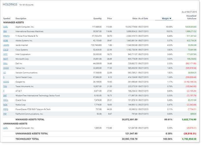 He creates a Holdings report that includes only assets in the Sector classified as Technology and he includes unmanaged assets, since he wants to make sure to alert clients even if he's not responsible for those accounts. Then he runs the Holdings report on the group of high net worth portfolios and confirms that none of them hold the security he's concerned about.