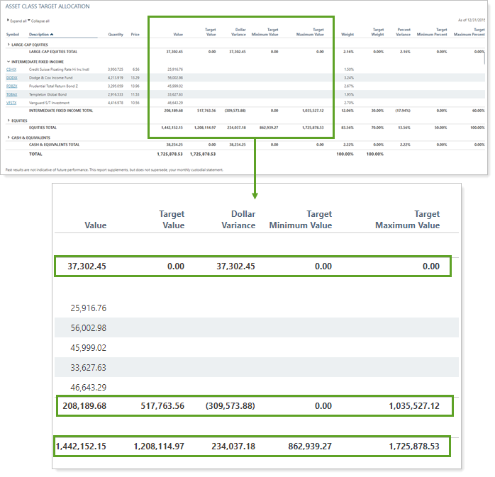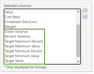Add any of the following target allocation columns to the report to see category-level target values, weights, and differences: