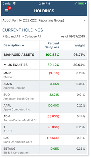 Powerful filtering lets you see only relevant data points for the designated securities. Control how much detail you see—anything from each position held in all the accounts within a group, to a broad, group-wide holdings summary.