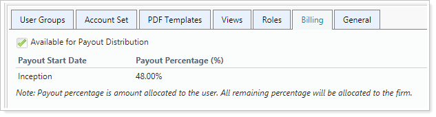 In User Management, select the Available for Payout Distribution check box, but don't edit the default payout percentages. For more information about user-level payout distributions settings, see Manage Permissions for Billing.