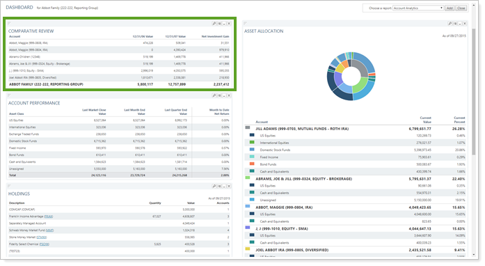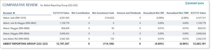 The Comparative Review report presents account-level data including category values and weights, contributions, and rates of return (both TWR and IRR) for one specific date period. This report tells a comparative story of how one account did, with the entire group or account set for context. This report can also show you how the value of your accounts is distributed among your asset classes.