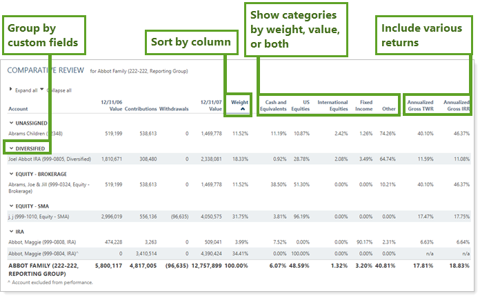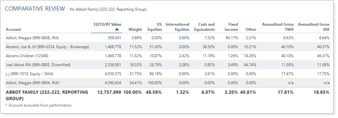 Using a Comparative Review report, the advisor adds a column showing weights of the major categories held within the group: US Equities, International Equities, Cash and Equivalents, and Fixed Income. The report automatically aggregates all the other categories into the Other column. The advisor also includes annualized gross TWR and annualized gross IRR columns to review the overall account's returns in comparison with the other accounts in the group.
