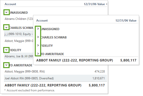 How Did One Account's Performance Compare with Others In the Group? See the value, flows, weights, returns, and more for a single date period for all the accounts in a group or account set.