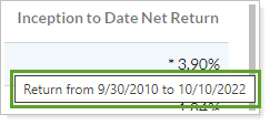 On dynamic reports, hover text displays both start and end dates for partial period returns. If you're using the enhanced performance calculations and there was more than one open period during the selected date range, you will see the start date of the first holding period and the end date of the final holding period.