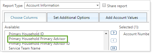 If the account has multiple primary advisors, Tamarac displays the first primary advisor listed as the Primary Household Primary Advisor in bulk reports. For more information on service teams, see Service Teams.