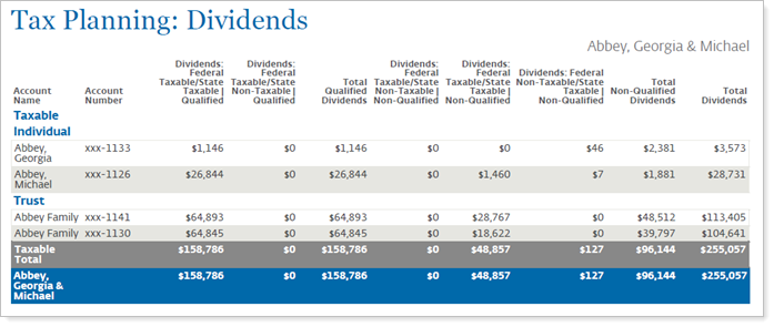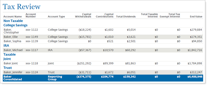 What Taxable Interest, Dividends, and Gains Did This Account Accumulate Over the Period? Create a tax planning version of the Comparative Review PDF report to see and share tax planning data points for various income and expense sources, realized gains and losses, and more, with clients and their tax preparers. Group accounts by tax status to separate taxable and non-taxable.