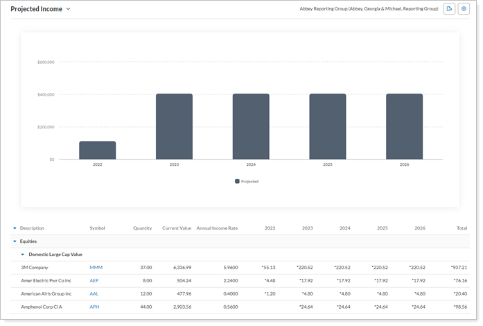 The advisor uses a Projected Income report to look at the client's taxable accounts for the next five years. The chart provides a broad overview of the income expected to receive, and the table, sorted by equity type, helps the advisor drill into the income source and possible tax repercussions.
