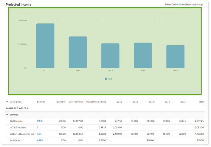 The Projected Income report displays a table and an optional bar chart for a sequential list of periods. The portfolio securities are listed line-by-line in the table along with the actual or expected payment received in each period. Totals are aggregated by category for each period. The bar chart provides a visual representation of the overall paid and projected income for each date period.