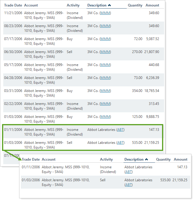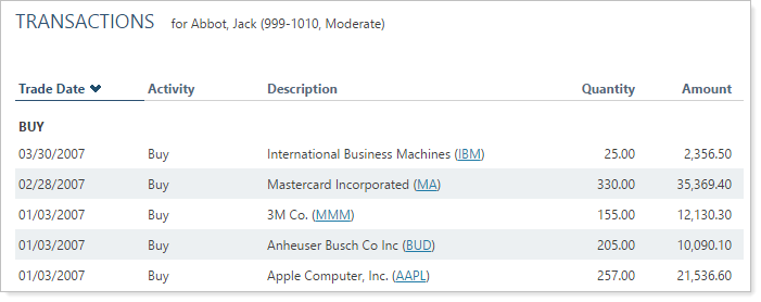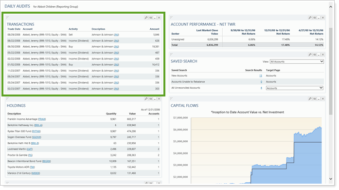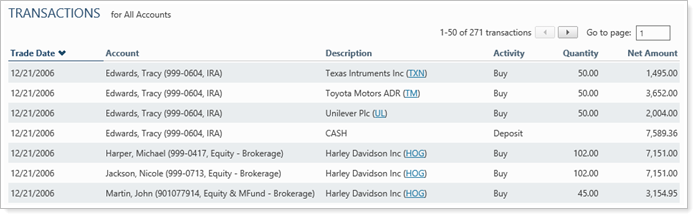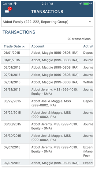 What transactions occurred in this account or Group?See all activities within an account for a set date period, or filter with saved searches and configure settings to see only specific transaction types or securities.