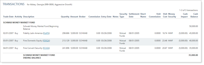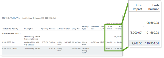 An advisor notices that an account dipped below the desired cash balance amount and wants to know how this occurred. She configures the Transaction report Group by option to Money Security, which adds the money security columns to the report. This allows her to easily track the impact of every cash transaction on the account's cash balance and to see exactly how the account arrived at its current cash balance.