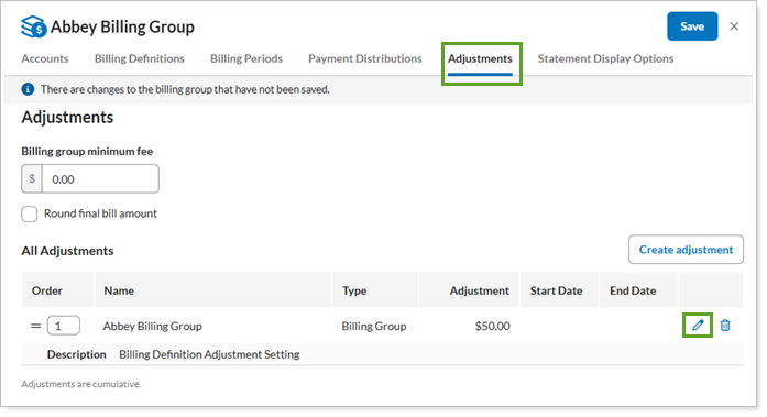 When you create a billing statement, you can choose whether to show or hide each type of billing adjustment. For more information, see Show Adjustments.
