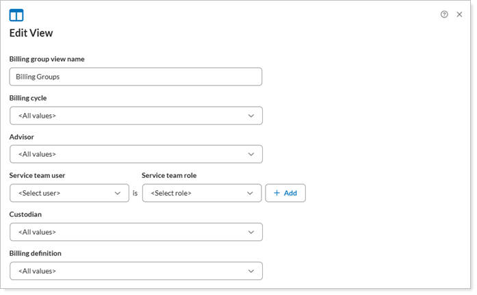 The filters are applied to accounts within the billing group. Each filter uses OR logic. This means that billing groups containing any account matching any of the criteria will be displayed in the results. For example, if you add a report view that filters for custodian, you will see a list of all billing groups that contain even one account that has that custodian assigned.