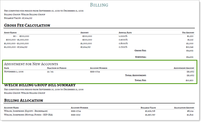 When new accounts come in partway through a period, you don't want to bill as if you managed their assets for the whole time. In this case, some firms will want to prorate the new account based only on the number of days in the period, helping to reduce the impact of market changes on the account before the first invoice is issued. Other firms may prefer to treat the new account as a capital flow, and adjust accordingly.
