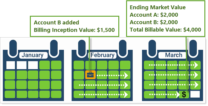 A billing group contains two accounts: Account A and Account B. Account B is a new account that was opened 23 days into the period with a $1,500 value. At the end of the billing period, each account has an ending market value of $2,000, giving the billing group a total billable value of $4,000.