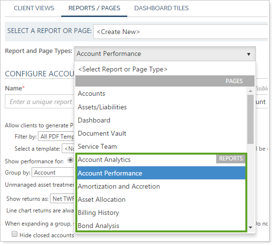 Most performance, holdings, and transaction dynamic reports in Tamarac Reporting can be shared to your client via the client portal. To share the reports, you first configure the report page and then add it to the client view. When configuring reports, all settings work the same as they do in your version of Tamarac Reporting. For example, the setting for Display changes to benchmark assignments will work the same on your version of Tamarac Reporting as it will in the end client portal.