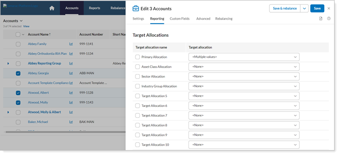 - Select the multiple accounts or groups where you want to assign a target allocation.