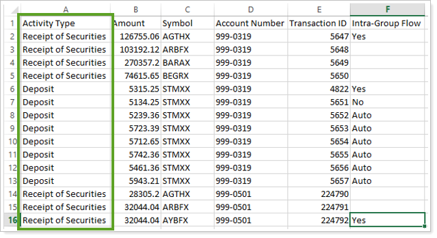 Automatic Matching With automatic matching, transactions—deposits, withdrawals, receipts, and transfers—for a specific security within a group must match and net to zero for a given day to be excluded as an intra-group flow. If there are any additional transactions for the given security, the intra-group flows for that security on that day will not match. Tamarac Reporting will not match transaction-by-transaction for contributions. For more information, see Automatic Matching Examples.