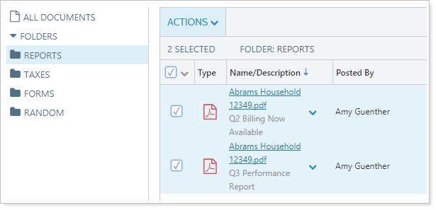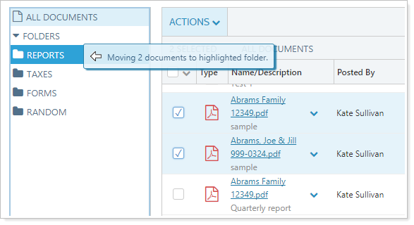 To assign multiple documents you've posted to a client portal to a folder, you have the following two options: Drag and drop or use the menu.