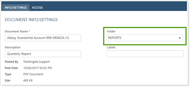 Folders represent the high-level document categories that your firm can use to help sort files posted to them. They can help you and your clients group similar content. You can still use labels to organize files, which means that you have multi-level organization—for example, you can have a Tax Documents folder containing files with labels for Abbot Family, Abbey Family, etc.