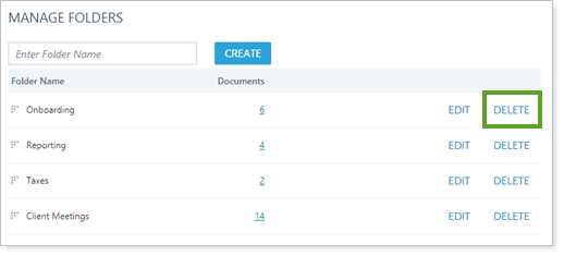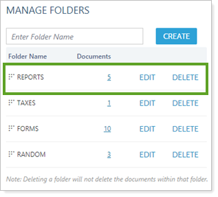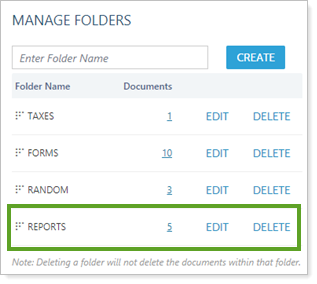 Folders are easy to create and remove. On the Manage Folders page, found under Documents, you can create, edit, organize, and delete folders.