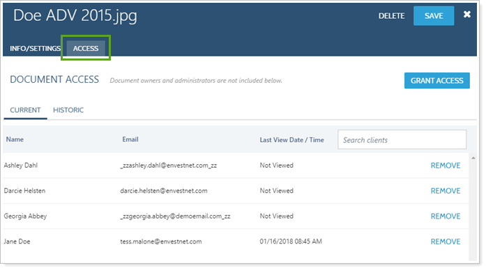 To see a list of clients who accessed previous versions of the document, click Historic.
