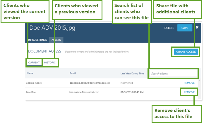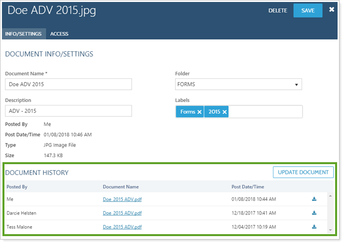 If you have ever uploaded a file to clients and then needed to change it, you've wanted to know which clients have seen that document and which haven't. In the document vault, each file has its own panel that provides information on settings and access.