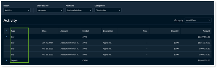 In the past, the Activity page showed all the transactions in a flat list. This made it difficult to see patterns or organize the data meaningfully. Now, you can group the Activity page by activity type or money security to provide a more organized view of transactions for your clients.