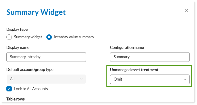 To add these new columns on the page, in the Configuration Tool, on the Summary widget, if you selected Intraday value summary, you can also set its Unmanaged asset treatment.