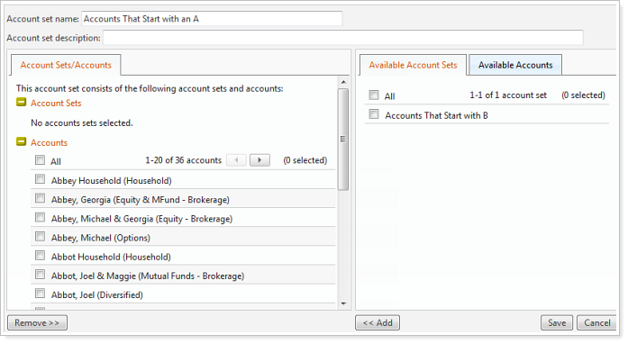 On the Available Accounts tab, choose the accounts you want to add to the account set and then click Add.