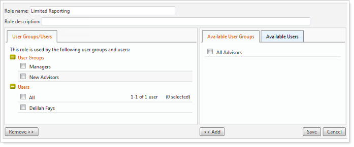 You do this by creating user groups and then setting up roles and assignments that tell Advisor View which users or groups are allowed to perform certain tasks in the program. If a user is not authorized for certain tasks or program areas, the related menu items or buttons are hidden or disabled.